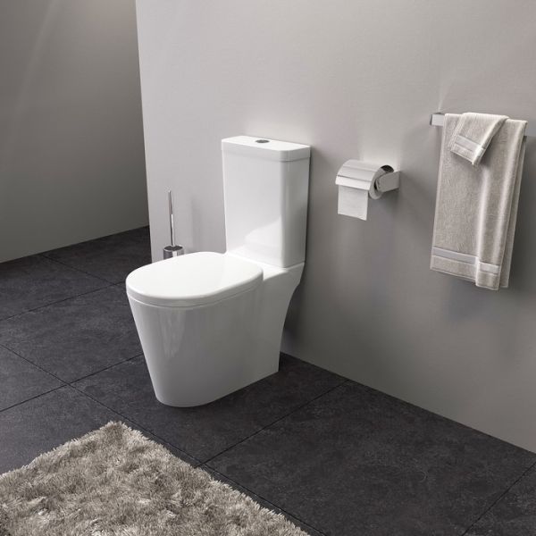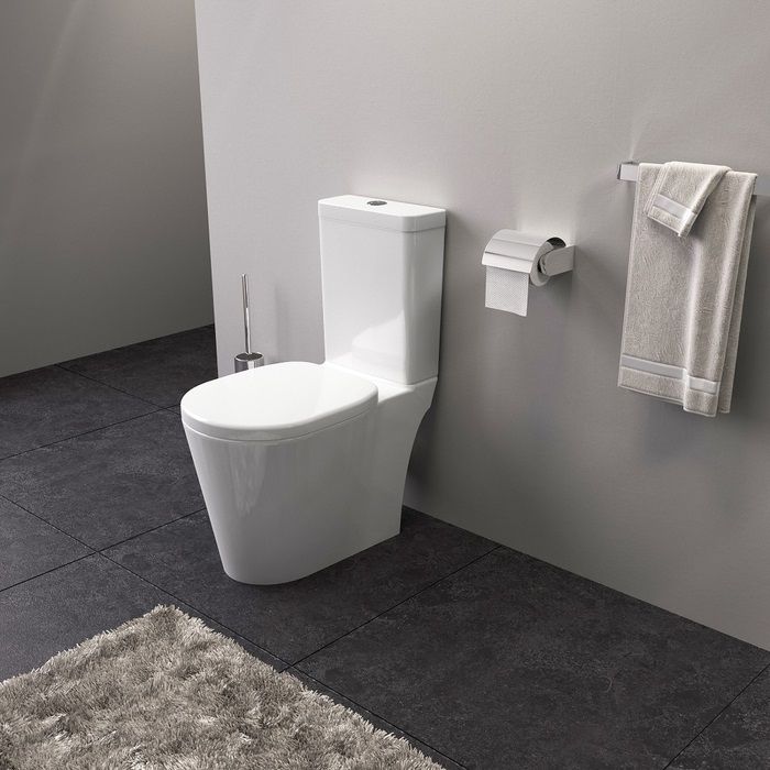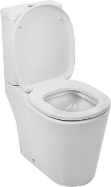 Унитаз-компакт с сиденьем из дюропласта с функциями Soft Close и Easy Fix, горизонтальный выпуск, двухуровневая водосливная арматура с кнопкой 38 мм. Упаковка: картонная коробка.