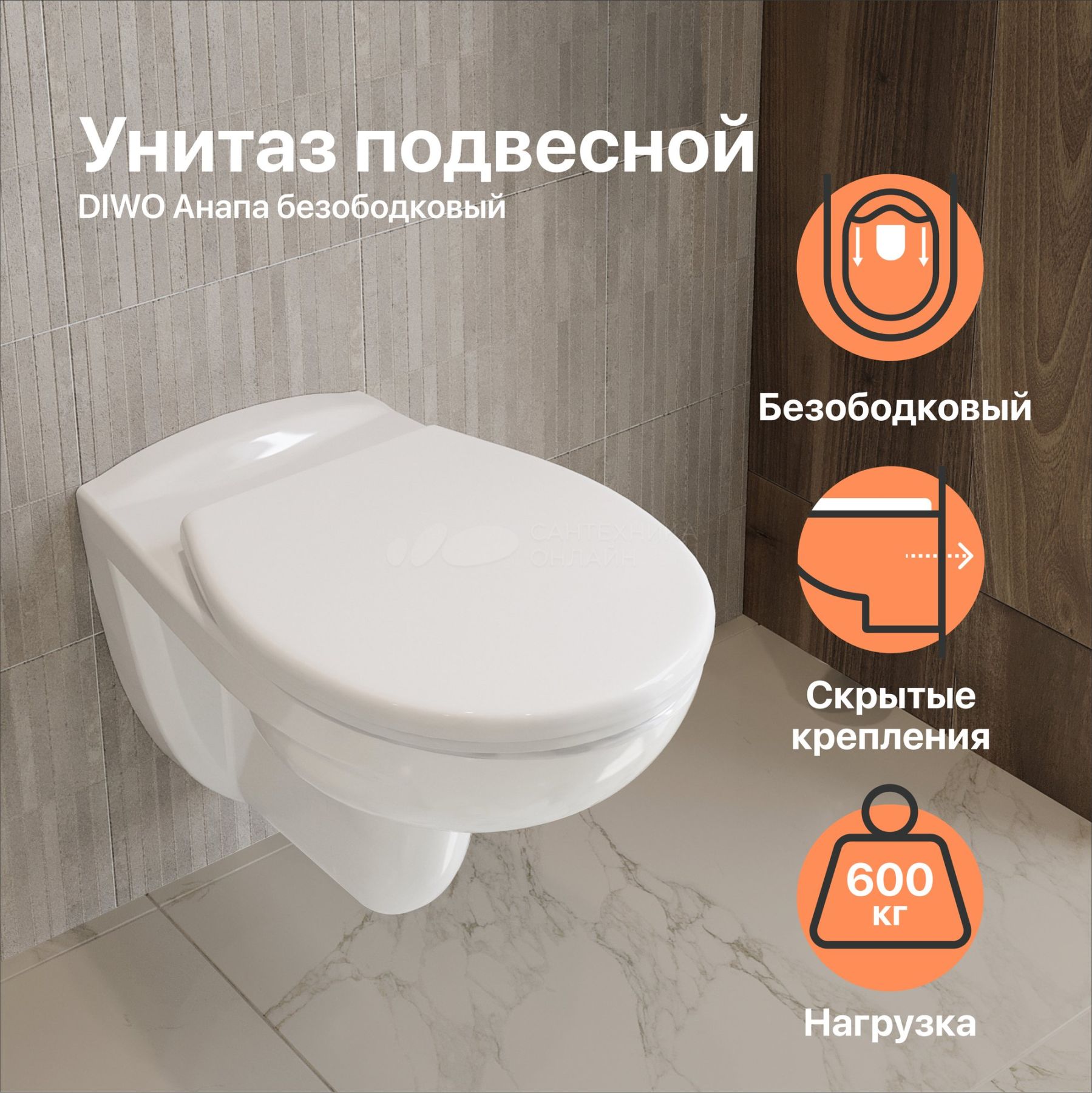 Белый унитаз DIWO «Анапа» — надежная подвесная модель из фарфора, способная выдержать нагрузку до 600 кг. За счет высокотемпературного обжига (1250 °С) материал непористый, что делает его устойчивым к впитыванию загрязнений и запахов. Испытания вакуумом на протечку гарантируют отсутствие микротрещин.Безободковая чаша гигиенична и проста в уборке. Испанская глазурь и антибактериальное покрытие с ионами серебра дарят отличную защиту от загрязнений. Стоит отметить полную глазуровку унитаза и выпуска до фановой трубы. Сифон целиком эмалирован. Современный способ смывания «воронка-водоворот» почти бесшумен и охватывает всю внутреннюю поверхность чаши.Модель имеет горизонтальное направление выпуска. Чаша отшлифована в местах присоединения к стене, что обеспечивает ее идеальное прилегание. Еще один плюс такой конструкции — по бокам унитаза нет технологических выемок для крепления, поэтому исключено скопление пыли и грязи. В комплекте сиденье из термопласта с особым UF-покрытием, которое со временем не пожелтеет. Унитаз российского производства с гарантийным сроком 10 лет.Горизонтальный выпуск (в стену)