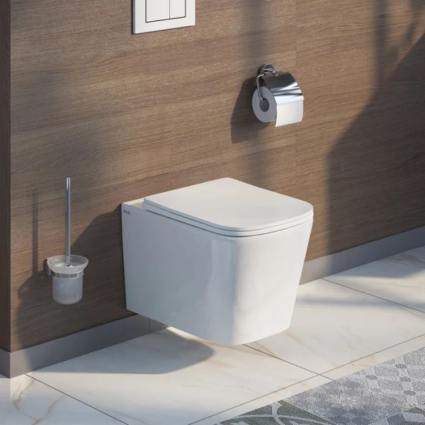 Унитаз подвесной безободковый с тонким сиденьем из дюропласта с EasyFix и SoftClose. Прямоугольная форма чаши. Комплект крепежа. Размер: 485х342х355 мм (ДхШхВ). Упаковка: картонная коробка.