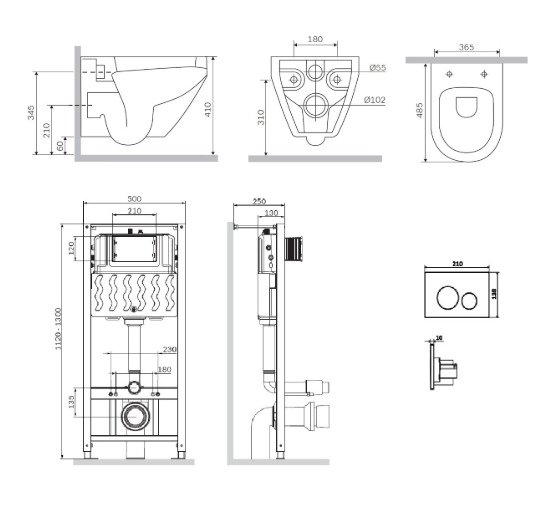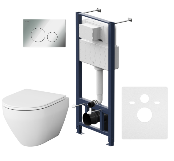 Полностью готовый к установке комплект: система инсталляции с клавишей, подвесной унитаз сиденьем.Не разборная рама из стального профиля выдерживает нагрузку до