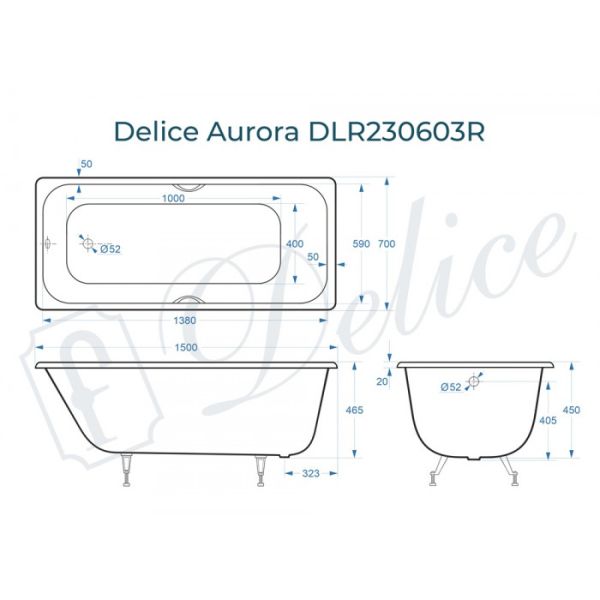 Ванна чугунная Delice Aurora DLR230603R 150x70 с отверстиями под ручки купить