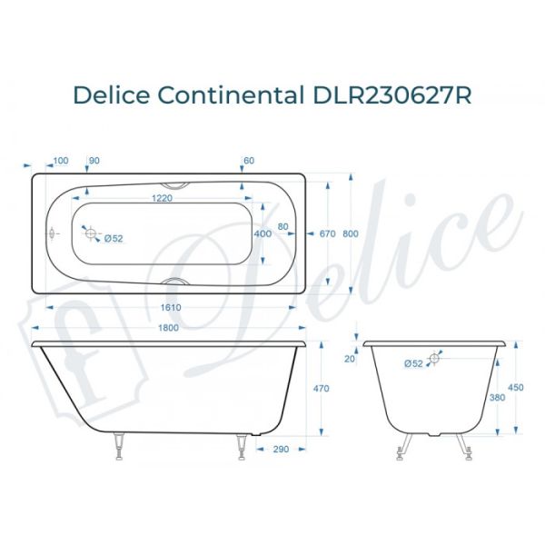 Ванна чугунная Delice Continental DLR230627R 180х80 с отверстиями под ручки купить