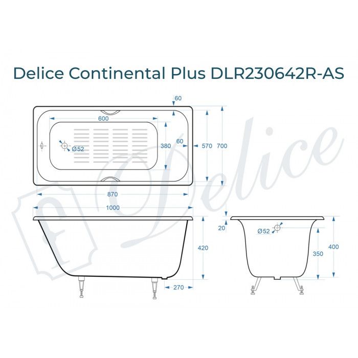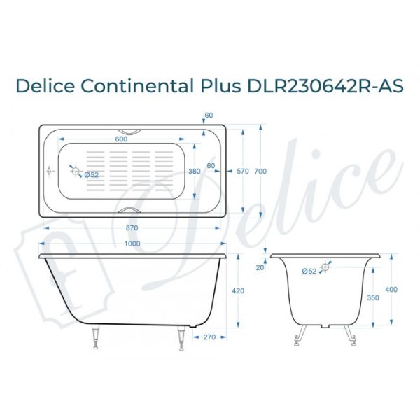 Ванна чугунная Delice Continental PLUS 100х70 с отверстиями под ручки и антискользящим покрытием купить