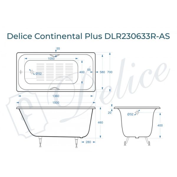 Ванна чугунная Delice Continental PLUS DLR230633R-AS с отверстиями под ручки и антискользящим покрытием 150х70 см купить