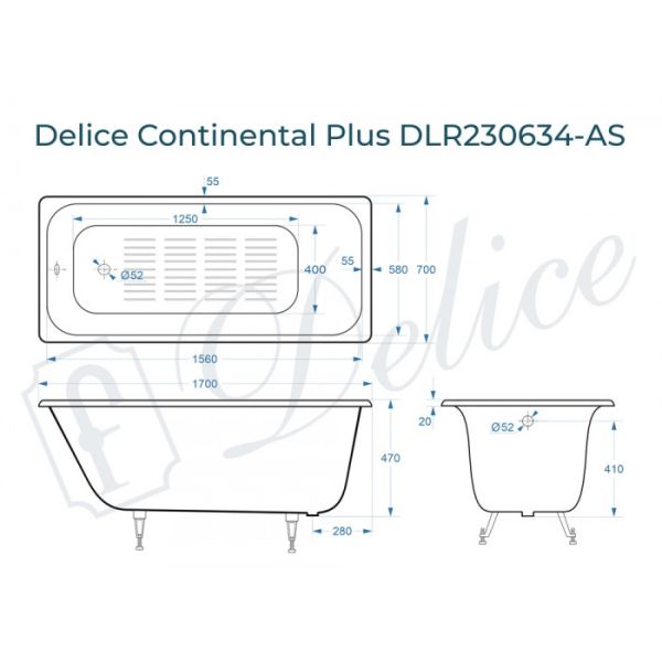 Ванна чугунная Delice Continental PLUS DLR230634-AS с антискользящим покрытием 170х70 см купить