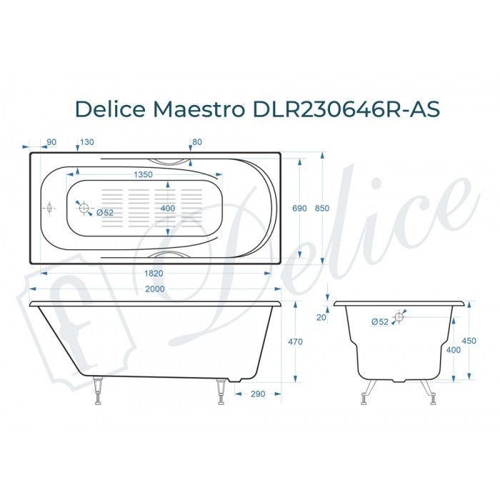 Ванна чугунная Delice Maestro DLR230646R-AS 200х85 с отверстиями под ручки и антискользящим покрытием купить