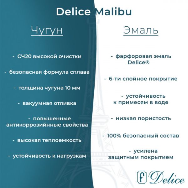 Чугунная ванна Delice - это отличный способ отвлечься от повседневных проблем и избавиться от стресса во время принятия водных процедур. Основным преимуществом ванны из чугуна является простота в уходе и устойчивость эмали ванны перед большинством механических повреждений.Прямоугольная форма ванны идеально подойдет к любому интерьерному решению. Пристенный монтаж - наиболее традиционный вид установки. Оптимальная глубина составляет 46,2 см, что позволяет принимать ванну с максимальным комфортом. Ванна Delice выполнена со строгим соблюдением всех актуальных элементов современного стиля. Ванны Delice производятся с исключительными стандартами качества, по сертифицированным технологиям, с использованием надежных безвредных материалов. Чугунна ванна Delice сделает любое дизайнерское решение не только практичным в плане использования, но и стильным с точки зрения эстетики.