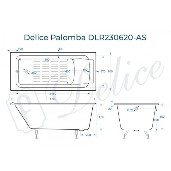 Ванна чугунная Delice Palomba DLR230620-AS 170х70 с антискользящим покрытием купить