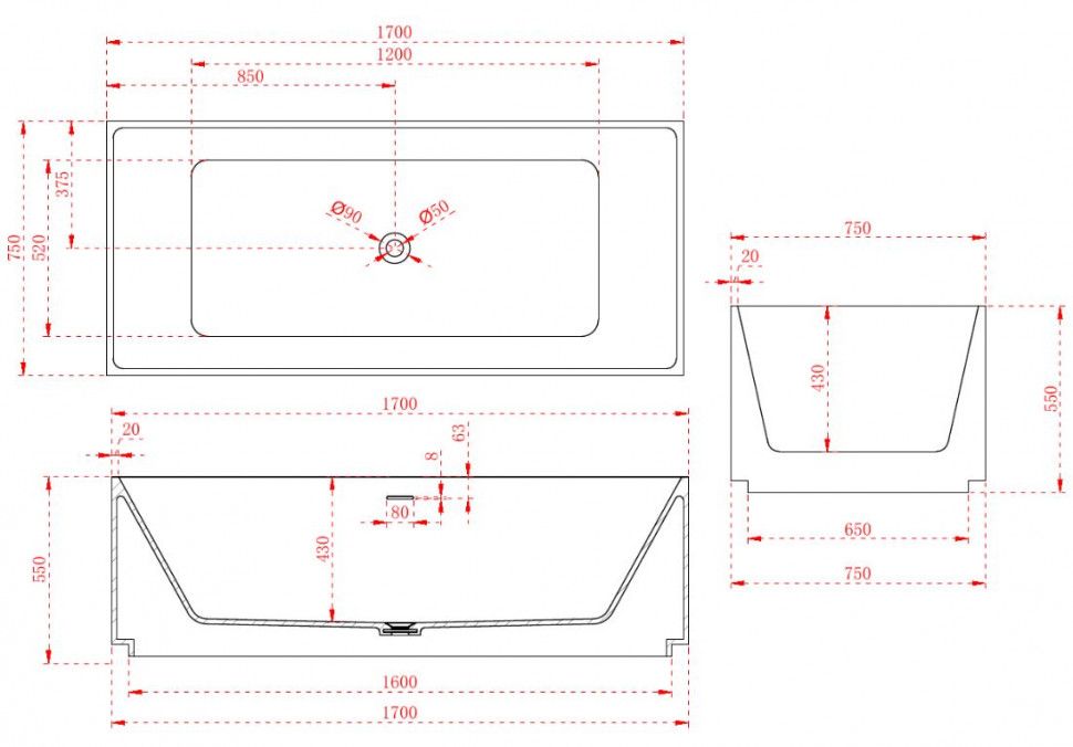 Стандартные размеры, см:170x75