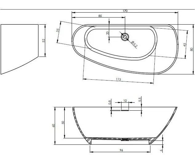 Отдельно стоящая, асимметричная ванна Solid Surface RIHO GRANADA 170 x 80 левая - композитная ванна, изготовленная из однородной каменной массы - каменная на ощупь, тёплая внутри. Это имитация мрамора: белый матовый цвет ванны при наполнении водой заиграет оригинальной текстурой камня.