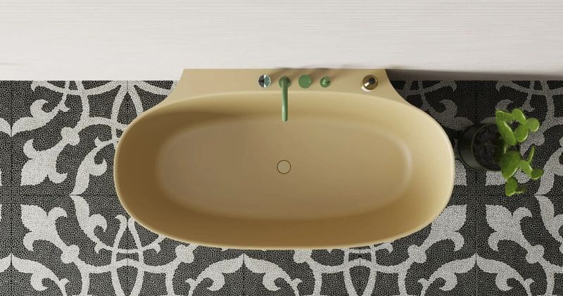 Эта модель соединяет в себе классическую овальную форму изголовий и спрятанный за ними пристенный борт. Благодаря такой конструкции создаётся впечатление отдельностоящей ванны, но сохраняется практичность плотного примыкания к стене и дополнительной поверхности для хранения косметических средств и аксессуаров. При желании здесь также можно разместить и смеситель. Более тонкая, детальная проработка формы чаши позволила уйти от классического понимания пристенной ванны с массивной боковой проекцией: блок, соприкасающийся со стеной, будто утоплен вдоль задней поверхности. Такова новая эстетика облегчённого дизайнерского решения Salini.