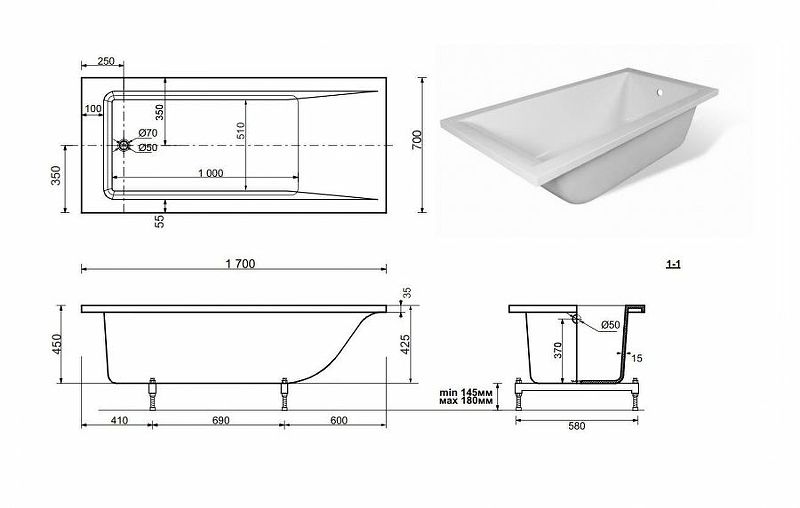 Ванна из литьевого мрамора Эстет Дельта 170А ФР-00000651 170x70см белый купить