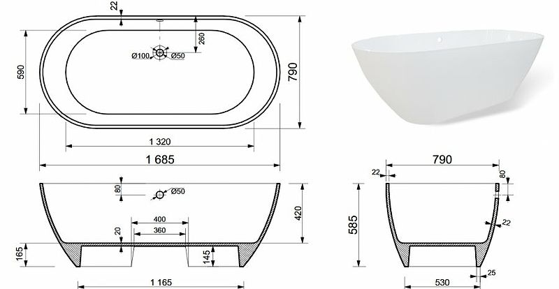 Ванна из литьевого мрамора Эстет Майами ФР-00003615 168x79см белый купить