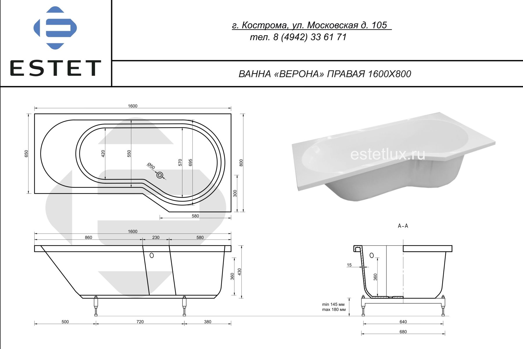 Ванна Верона - это удобство эксплуатации и впечатляющий внешний вид. Ассиметричная ванна с чёткими линиями добавит изюминку в ванную комнату и станет в интерьере основной деталью, создающей его характер и настроение.