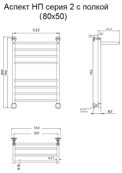Водяной полотенцесушитель Тругор Аспект НП 2 П с полкой 80x50см хром Аспект2/нп8050П купить