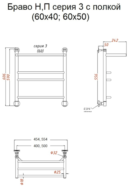 Водяной полотенцесушитель Тругор Браво НП 3 П с полкой 60x50см хром Браво3/нп6050П купить
