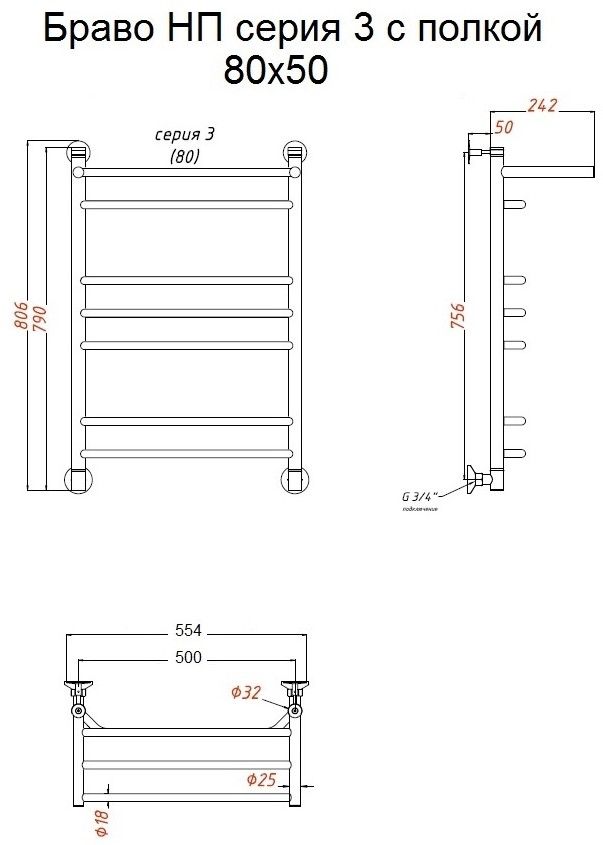 Водяной полотенцесушитель Тругор Браво НП 3 П с полкой 80x50см хром Браво3/нп8050П купить