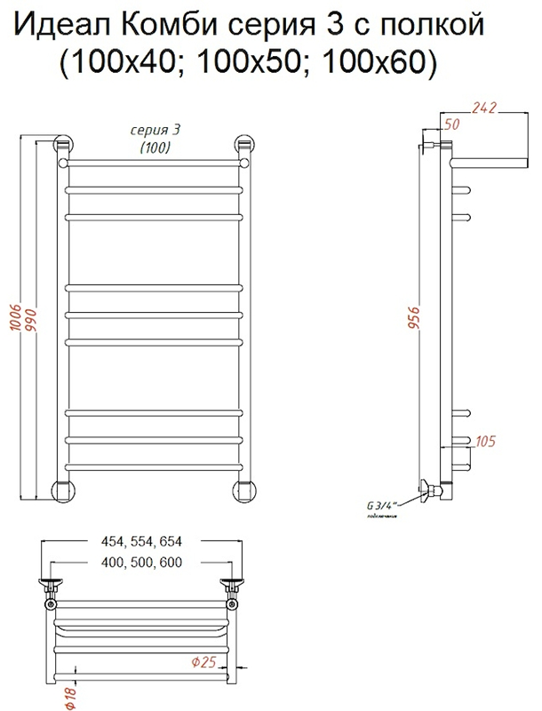 Водяной полотенцесушитель Тругор Идеал комби НП 3 П с полкой 100x50см хром Идеал/комби3/нп10050П купить