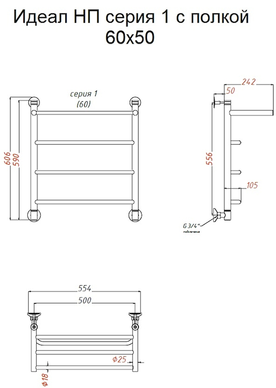 Водяной полотенцесушитель Тругор Идеал НП 1 П с полкой 60x50см хром Идеал1/нп6050П купить