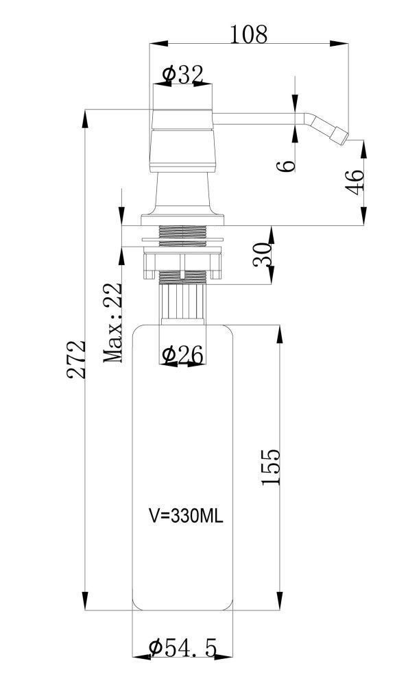Встраиваемый дозатор для мыла нержавеющая сталь, ABS - пластик.Максимальная толщина столешницы 37 ммЦвет: нержавеющая сталь.Объем: 330 мл