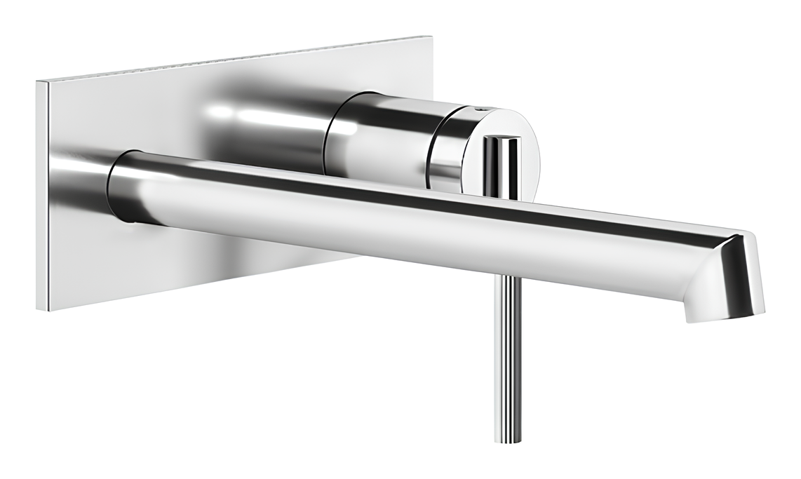 Настенный монтаж освобождает пространство на раковине, создавая минималистичный и чистый вид. Длинный излив обеспечивает удобный поток воды, что делает его идеальным выбором для просторных умывальников. Хромированное покрытие не только придаёт смесителю стильный блеск, но и защищает его от коррозии, известкового налёта и механических повреждений.