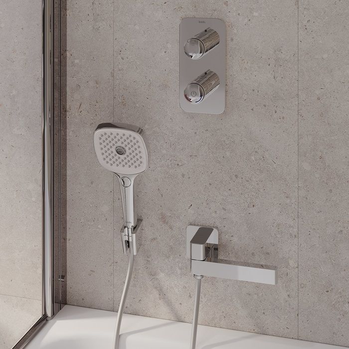 Встраиваемый смеситель Slide для ванны с инновационным кнопочным управлением Push Control – комбинация элегантного дизайна и современных технологий и функций, которые делают пребывание в ванной максимально комфортным и приятным. Две ручки-кнопки обеспечивают полный контроль над управлением всеми функциями смесителя: • Нижняя включает-выключает смеситель нажатием на кнопку и регулирует температуру воды при повороте вправо-влево.