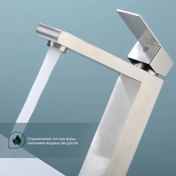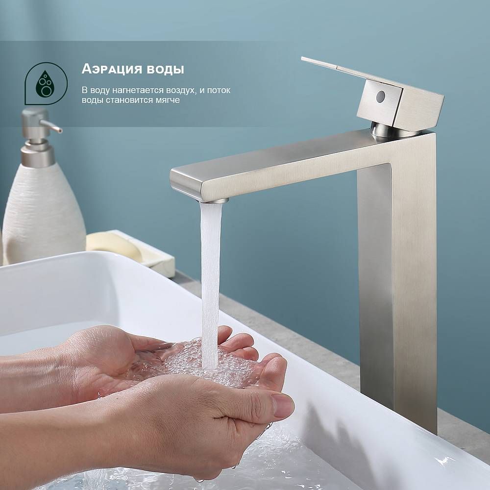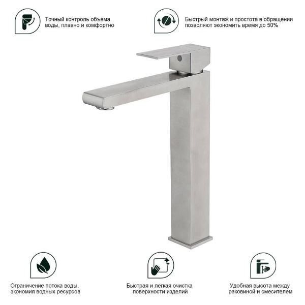 Смеситель для раковины Splenka S224.15.05, сатин. Смеситель высокий для раковины нержавеющая сталь, квадратной формы. Смеситель с креплением на гайке. Все для монтажа и эксплуатации есть в комплекте. Гарантия 5 лет.