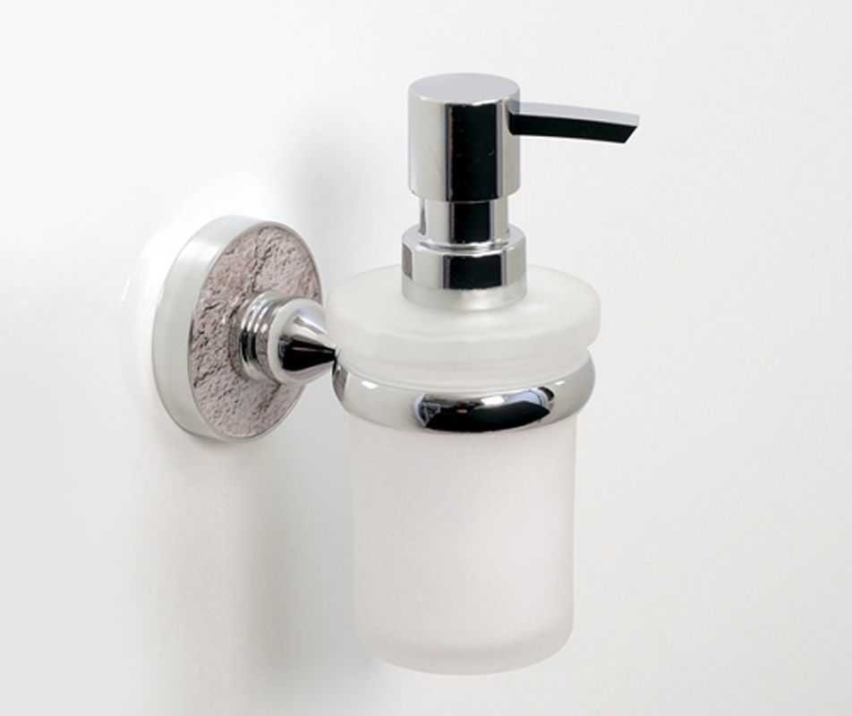 WasserKRAFT Дозатор для жидкого мыла с держателем K-7799Размер: Ш70 х Г111 х В148 ммМонтаж: настенныйЦвет держателя: хром, акриловая вставка "декоративный травертин"Дозатор: матовое стеклоОбъем: 170 млМатериалы: металл, акрил, хромоникелевое покрытие, уплотнительные пластиковые кольца, матовое стекло
