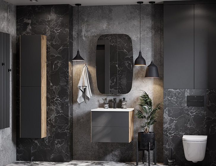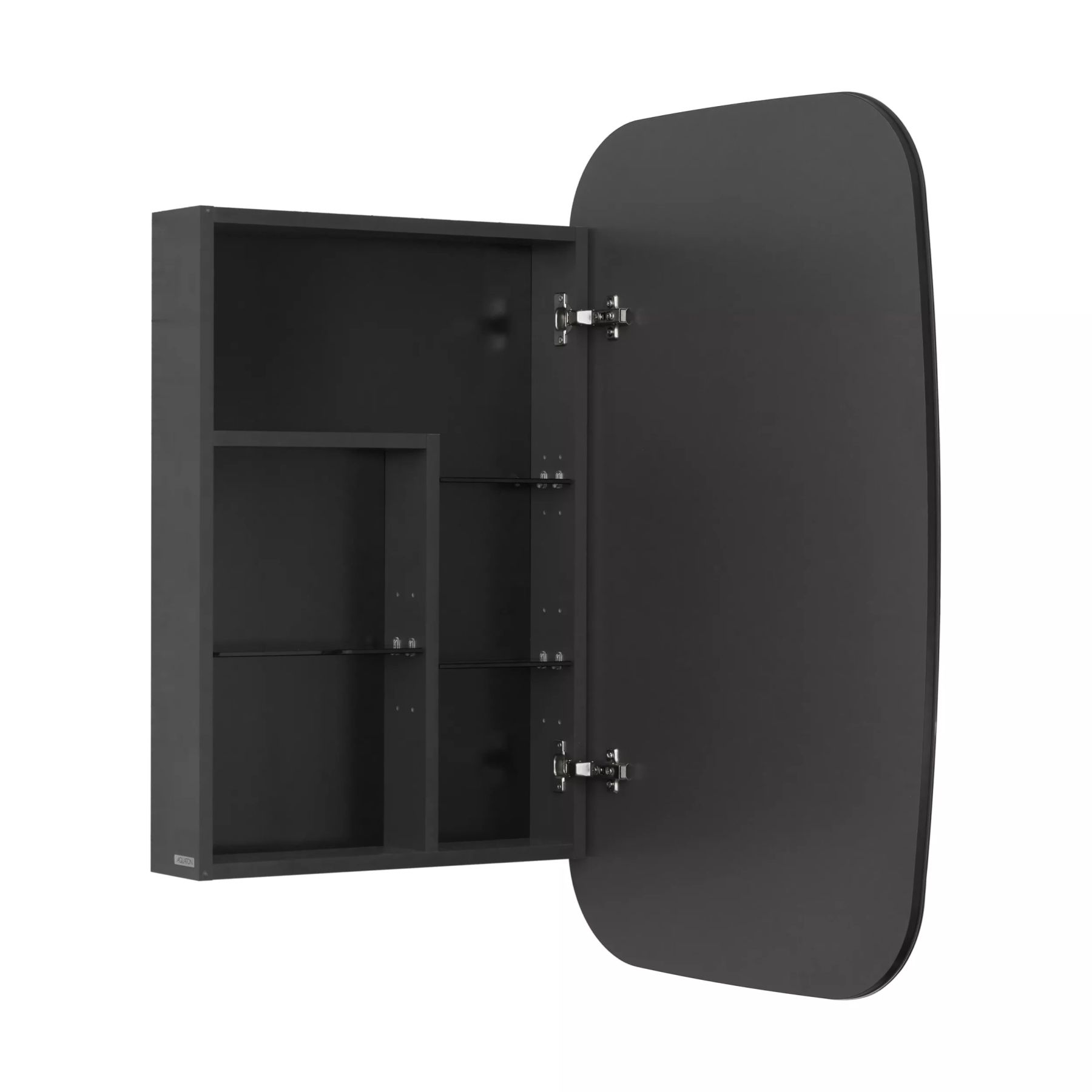 Сохо зеркало необычной овальной формы, скругленные углы добавляют индивидуальности изделию и безопасны в эксплуатации. Корпус и фасад выполнены также в цветовой гамме антрацит. Фасад оснащен петлями с доводчиком. За фасадом с зеркальным полотном расположена ассиметричная конструкция полочек, позволяющая хранить косметические средства различной высоты и объема. Перегородки из ЛВДСП антрацит сочетаются со стеклянными полочками цвета графит.
