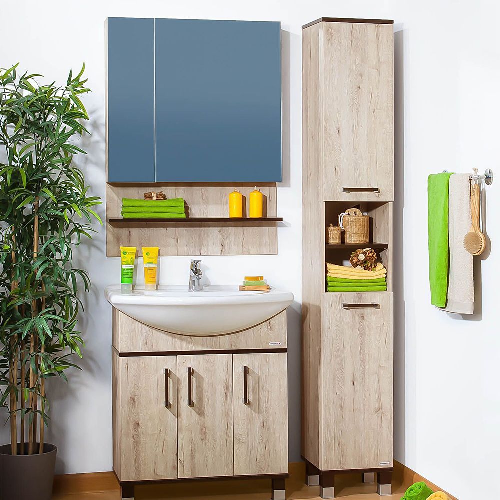 Внутреннее содержание шкафа умело организовано: разнообразные полки и отсеки позволяют удобно разместить все необходимые аксессуары – от косметики до бытовой химии. Зеркало, интегрированное в фасад, визуально расширяет пространство и облегчает утренние рутинные процедуры.