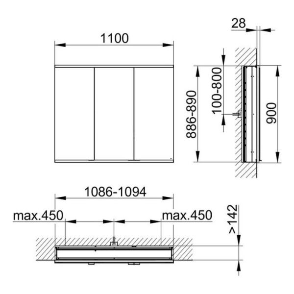 Зеркальный шкаф, алюминий серебристый анодированный,1100 x 900 x 160 mm,