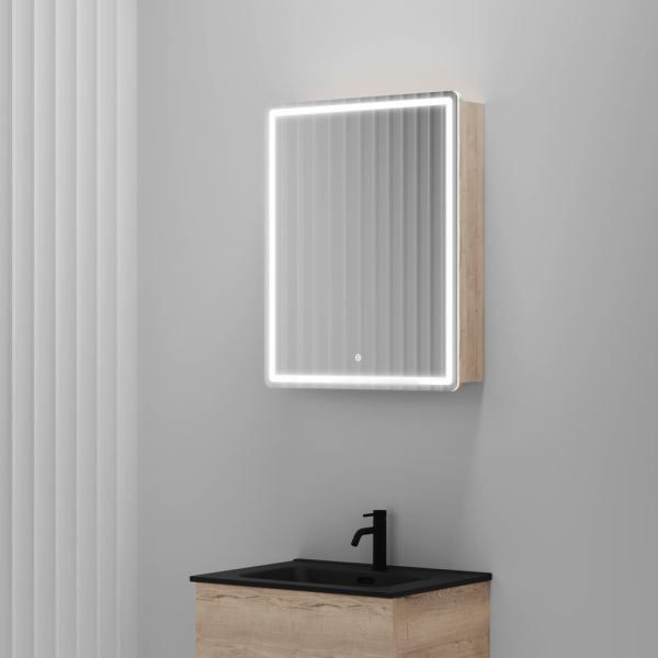 Зеркальный шкаф для ванной комнаты SANCOS Mirror 590x150х740 мм, с LED подсветкой, корпус выполнен из лдсп цвет дуб галифакс, диммируемое сенсорное управление подсветкой, арт. MI60EG
