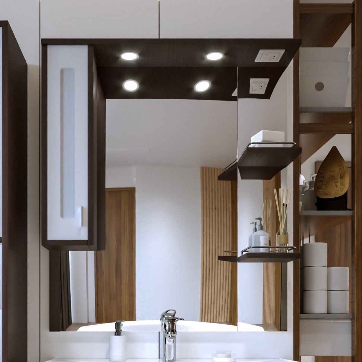 Внутреннее содержание шкафа умело организовано: разнообразные полки и отсеки позволяют удобно разместить все необходимые аксессуары – от косметики до бытовой химии. Зеркало, интегрированное в фасад, визуально расширяет пространство и облегчает утренние рутинные процедуры.