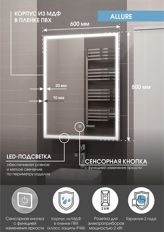 Зеркальный шкаф с подсветкой Misty Алюр 60см левый белый купить