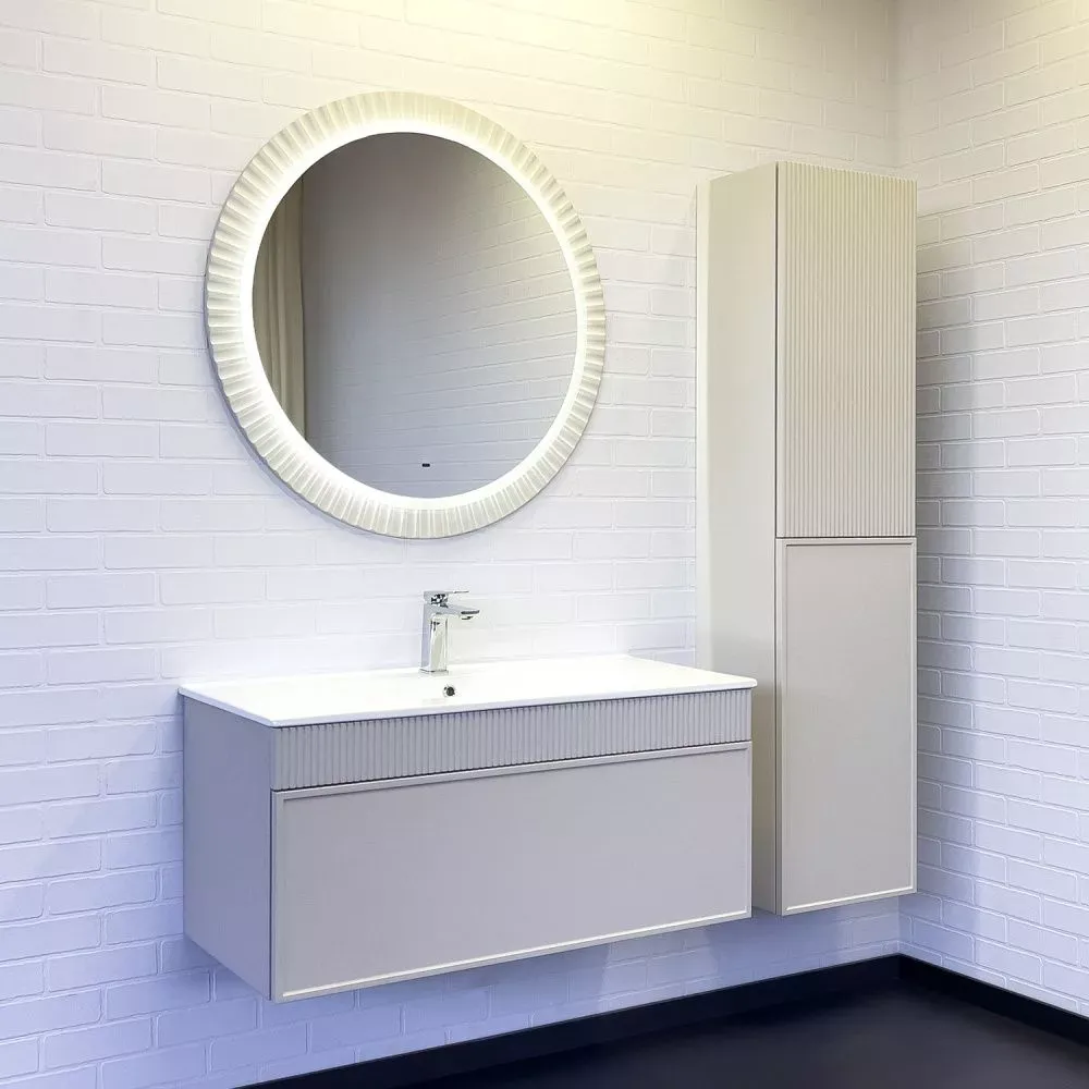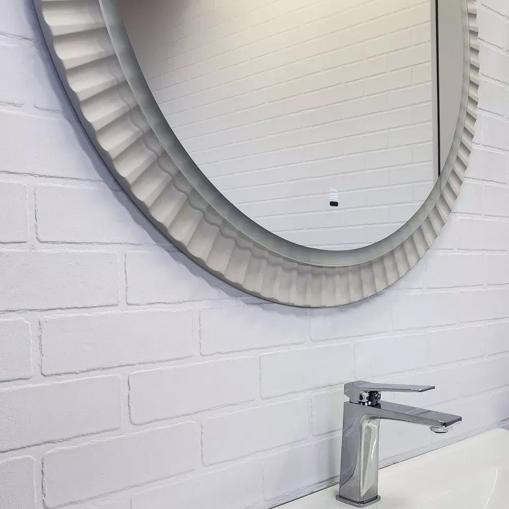 Габариты (ШхВхГ): 900*900*25 ммВысококачественное зеркальное полотно с амальгамой на основе серебра. Зеркало оборудовано ореольной и фронтальной Led подсветкой с бесконтактным включателем со встроенной функцией регулировки яркости. Температура подсветки: 6000-6500К холодная. Основа зеркала из МДФ фрезерована радиальным узором в виде лучей и облицована пленкой цвета серый шёлк.