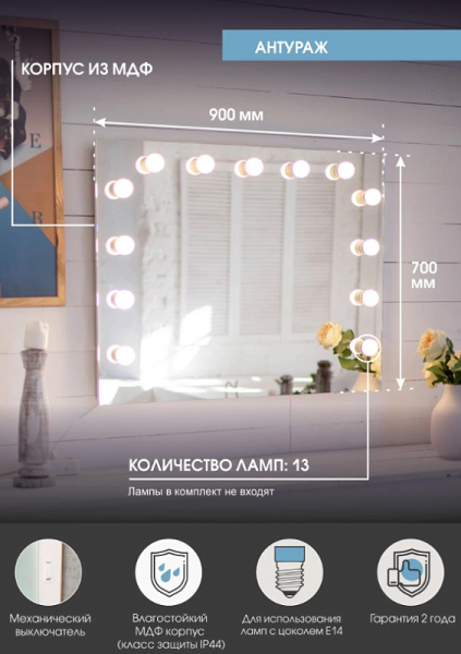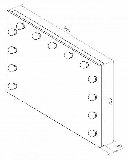 Зеркало Гримерное 900х700 (13 ламп)Гримерное зеркалоРекомендуется использовать светодиодные лампы с типом цоколя E14, мощностью 2-3 ВтЛампы в комплект не входят