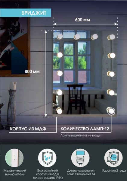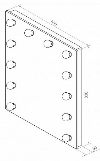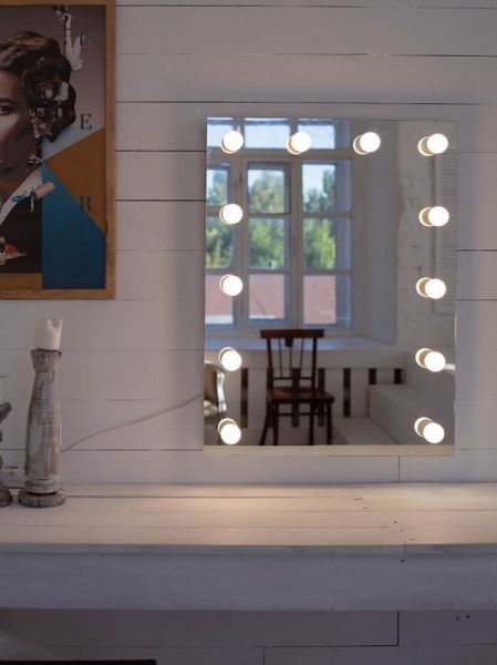 Зеркало Гримерное 600х800 12 лампГримерное зеркалоРекомендуется использовать светодиодные лампы с типом цоколя E14, мощностью 2-3 ВтЛампы в комплект не входят