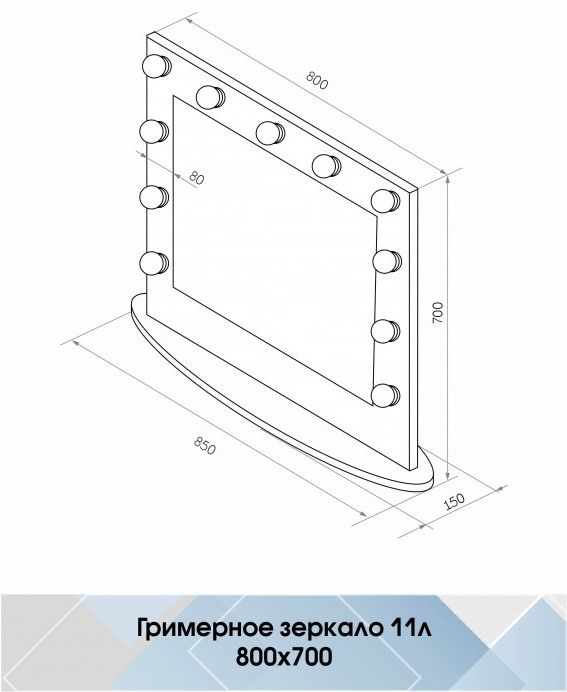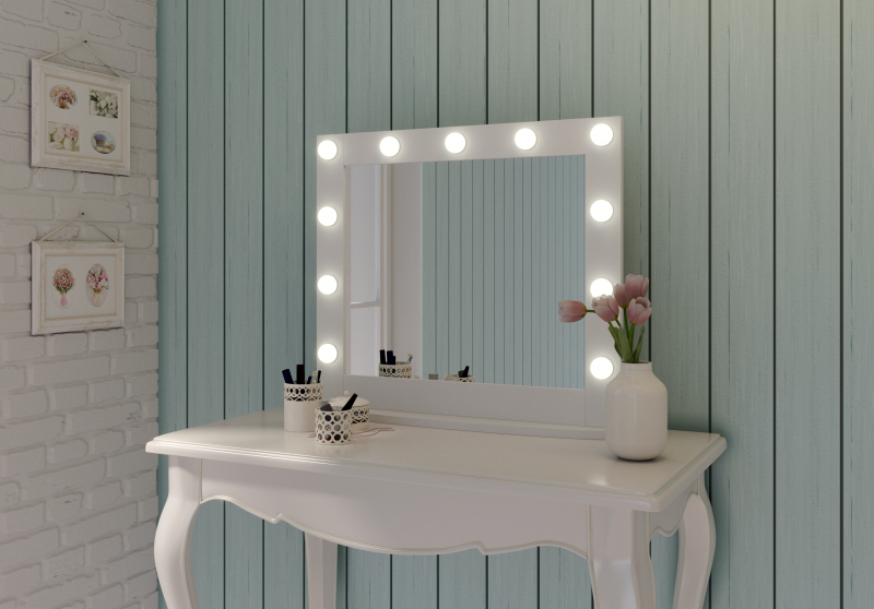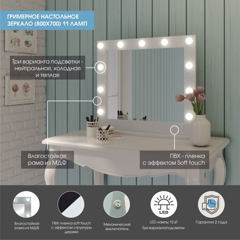 Зеркало Гримерное настольное белое 800х700 (11 ламп)LED подсветка 6000Кмеханический выключательрама МДФ цвет рамы - белый
