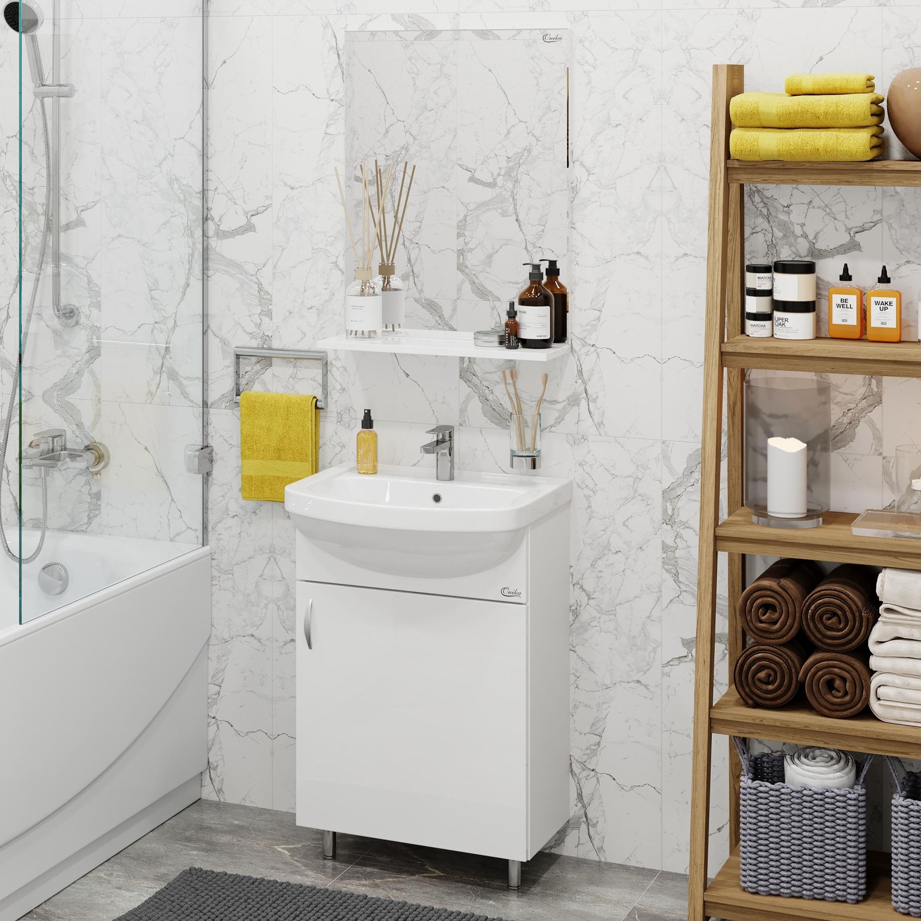 Зеркало выполнено из ЛДСП, устойчивой к механическим воздействиям, перепадам температур и высокой влажности.