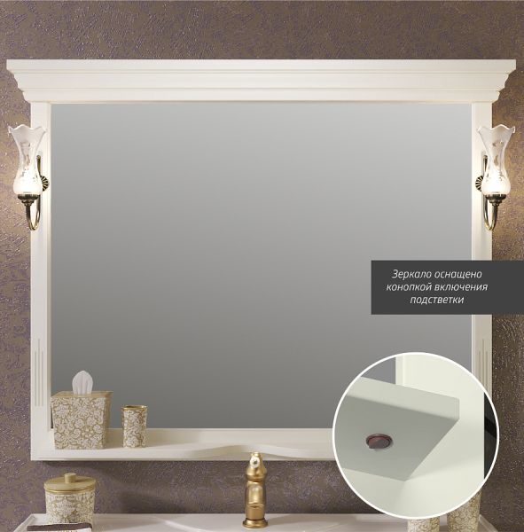 Светильники приобретаюся отдельно.Зеркала по умолчанию идут с отверстиями под светильники. В случае отсутствия необходимости заказа светильников, возможна комплектация зеркала декоративными накладками серебро или бронза.Коллекция Риспекто символизирует лучшие традиции неоклассики в сочетании с необыкновенной функциональностью и простотой дизайна.Строгий контроль при изготовлении изделий исключает наличие малейших дефектов. Зеркальное полотно дает четкое отражение без каких-либо искажений. Слоновая кость цвет прекрасно дополнит интерьер ванной комнаты.
