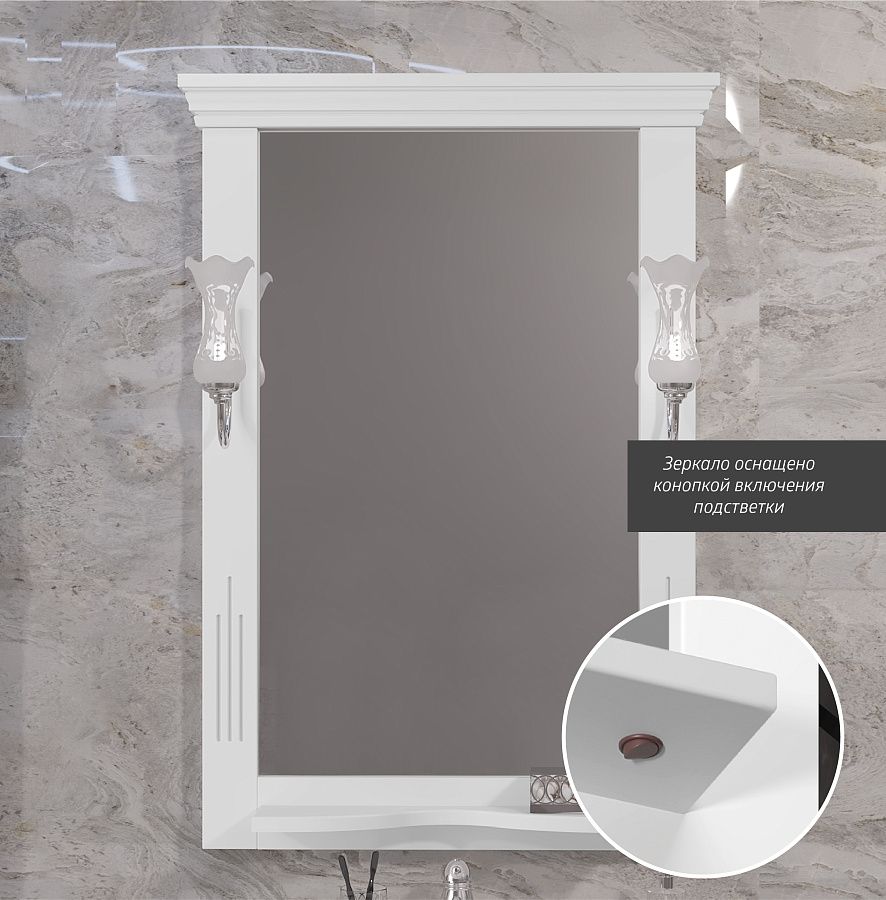 Светильники приобретаюся отдельно.Зеркала по умолчанию идут с отверстиями под светильники. В случае отсутствия необходимости заказа светильников, возможна комплектация зеркала декоративными накладками серебро или бронза.Коллекция Риспекто символизирует лучшие традиции неоклассики в сочетании с необыкновенной функциональностью и простотой дизайна.Строгий контроль при изготовлении изделий исключает наличие малейших дефектов. Зеркальное полотно дает четкое отражение без каких-либо искажений. Слоновая кость цвет прекрасно дополнит интерьер ванной комнаты.
