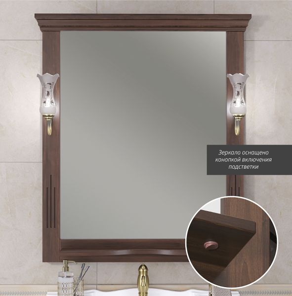 Светильники приобретаюся отдельно.Зеркала по умолчанию идут с отверстиями под светильники. В случае отсутствия необходимости заказа светильников, возможна комплектация зеркала декоративными накладками серебро или бронза.Коллекция Риспекто символизирует лучшие традиции неоклассики в сочетании с необыкновенной функциональностью и простотой дизайна.Строгий контроль при изготовлении изделий исключает наличие малейших дефектов. Зеркальное полотно дает четкое отражение без каких-либо искажений. Цвет орех антикварный прекрасно дополнит интерьер ванной комнаты.