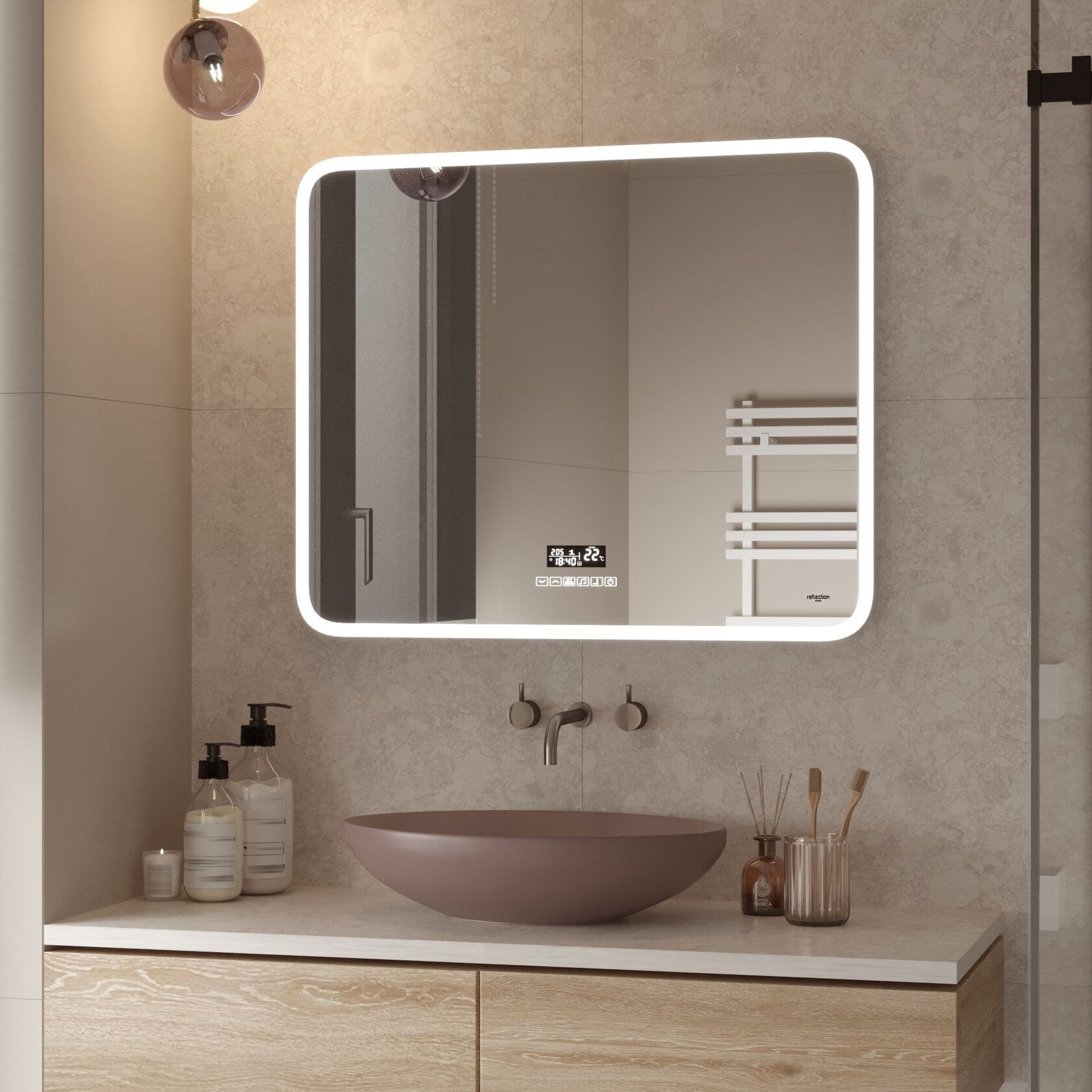 Reflexion Party - сочетание красоты и функциональности. Стильный современный дизайн зеркала дополнен медиасистемой с Bluetooth, FM приемником часами, термометром. Прекрасное качество звука превратит рутинные гигиенические процедуры в настоящий праздник. Система подогрева полотна предотвращает запотевание зеркала, включается вместе с подсветкой. Скругленные грани придают утонченный дизайн и безопасны для ваших детей.