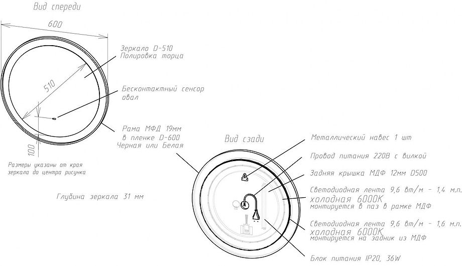 - Диаметр зеркала без обода: 510 мм