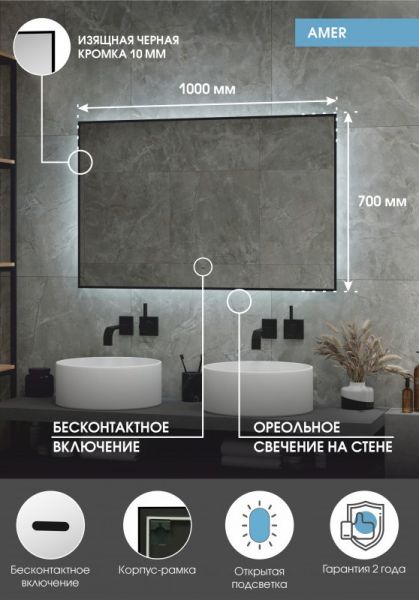 Зеркало "Amer Led" с фоновой подсветкой, бесконтактным сенсором, черной окантовкой 1000х700LED подсветка 6000К;бесконтактный сенсор с функцией димирования;открытая ореольная подсветка.