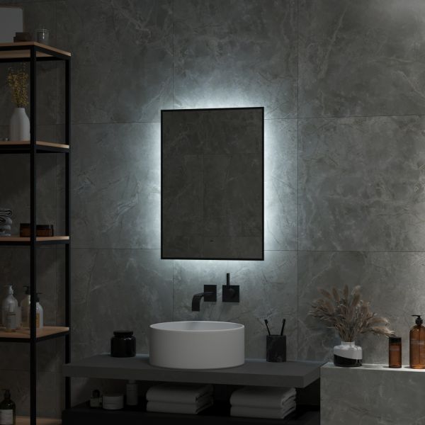 Зеркало "Amer Led" с фоновой подсветкой, бесконтактным сенсором, черной окантовкой 600х700LED подсветка 6000К;бесконтактный сенсор с функцией димирования;открытая ореольная подсветка.