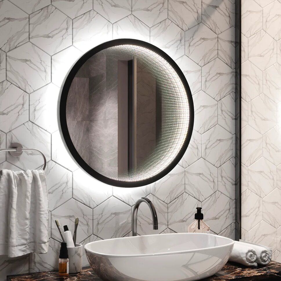 Зеркало "Infiniti Black Led" D 600 с датчиком движенияLED подсветка 6000Кдатчик движения на корпусеэффект тоннеля