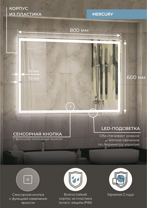 Зеркало "Mercury Led" 800х600LED подсветка 6000Ксенсорный выключатель с функцией димирования