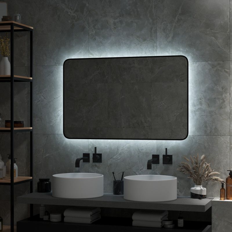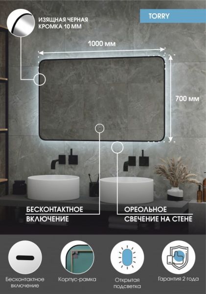 Зеркало "Torry Led" с фоновой подсветкой, бесконтактным сенсором, черной окантовкой 1000х700LED подсветка 6000К;бесконтактный сенсор с функцией димирования;открытая ореольная подсветка.