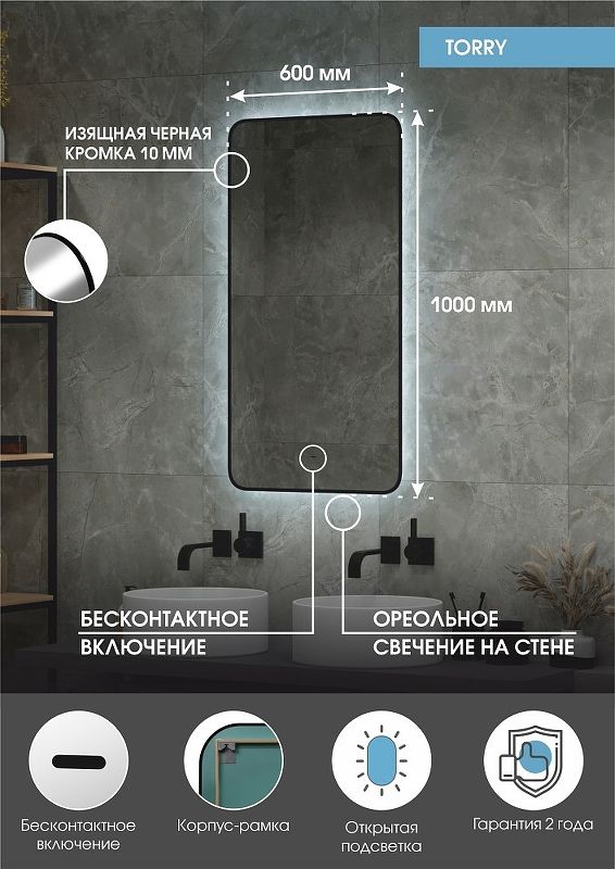 Зеркало "Torry Led" с фоновой подсветкой, бесконтактным сенсором, черной окантовкой 600х1000LED подсветка 6000К;бесконтактный сенсор с функцией димирования;открытая ореольная подсветка.